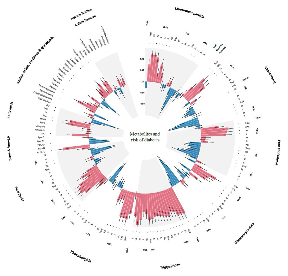 Figure 1. Associations of 168 metabolic biomarkers with risk of diabetes among 13,489 participants with prediabetes. Hazard ratios (HRs) were presented per 1 standard deviation (SD) higher of metabolic biomarkers on the natural log scale and were adjusted for age, sex, ethnicity, education, Townsend Deprivation Index, employment status, household income, family history of diabetes, history of CVD, history of hypertension, history of dyslipidemia, history of CLD, history of cancer, body mass index, waist circumference, hip circumference, smoking status, moderate alcohol, healthy diet score, healthy sleep score, physical activity, systolic blood pressure, diastolic blood pressure, and glycated hemoglobin A1c. Source: Li et al., 2024.